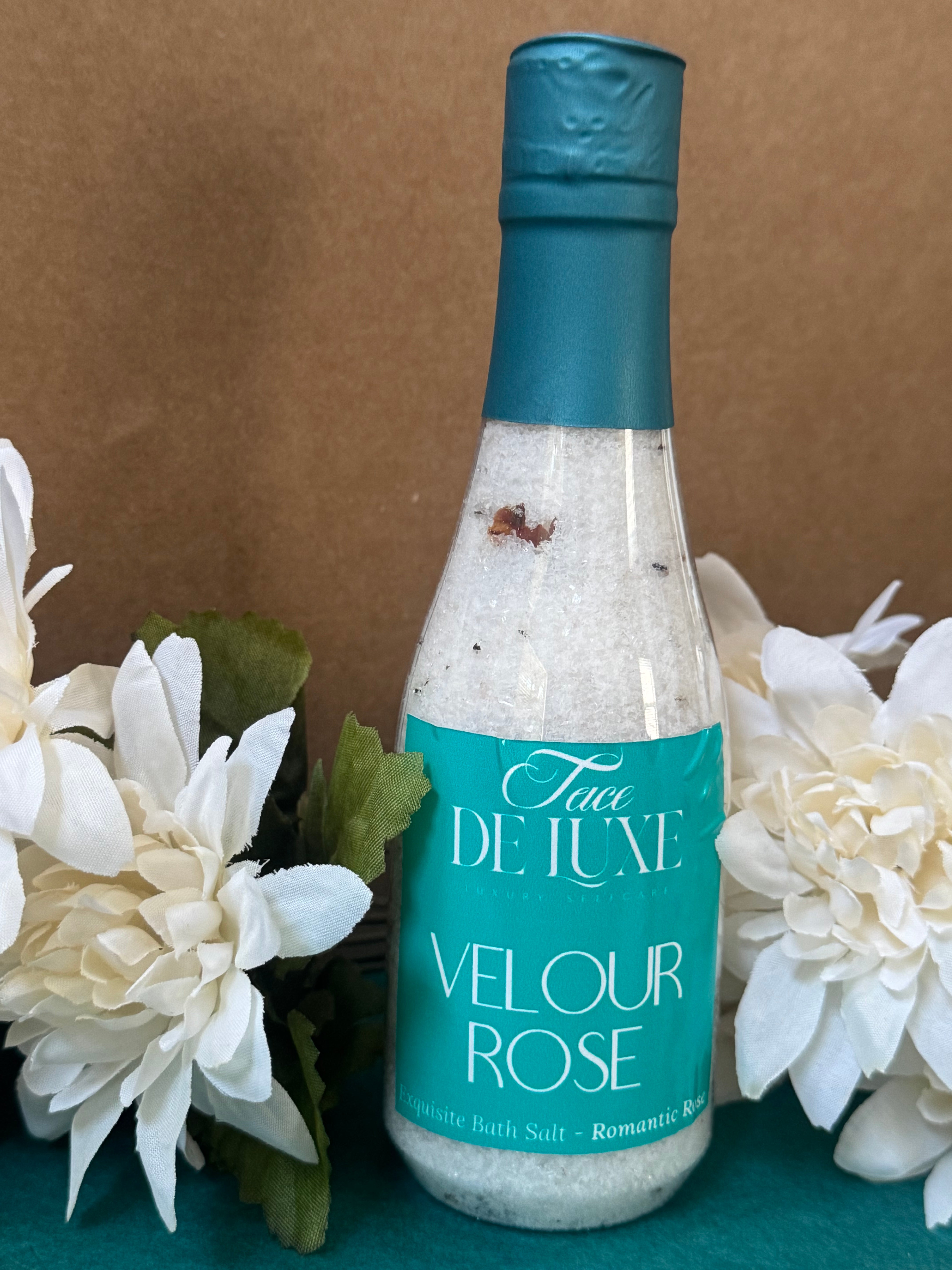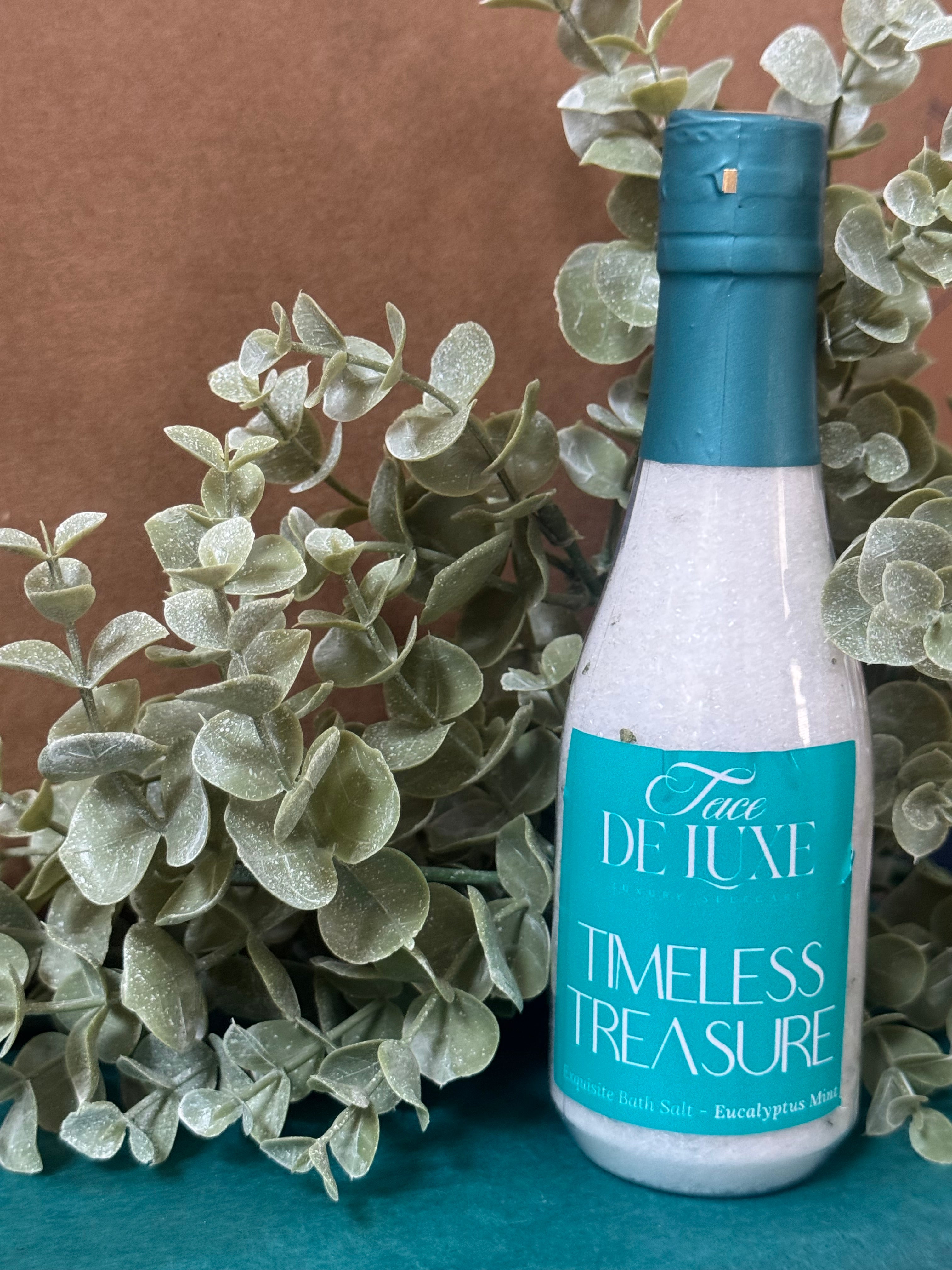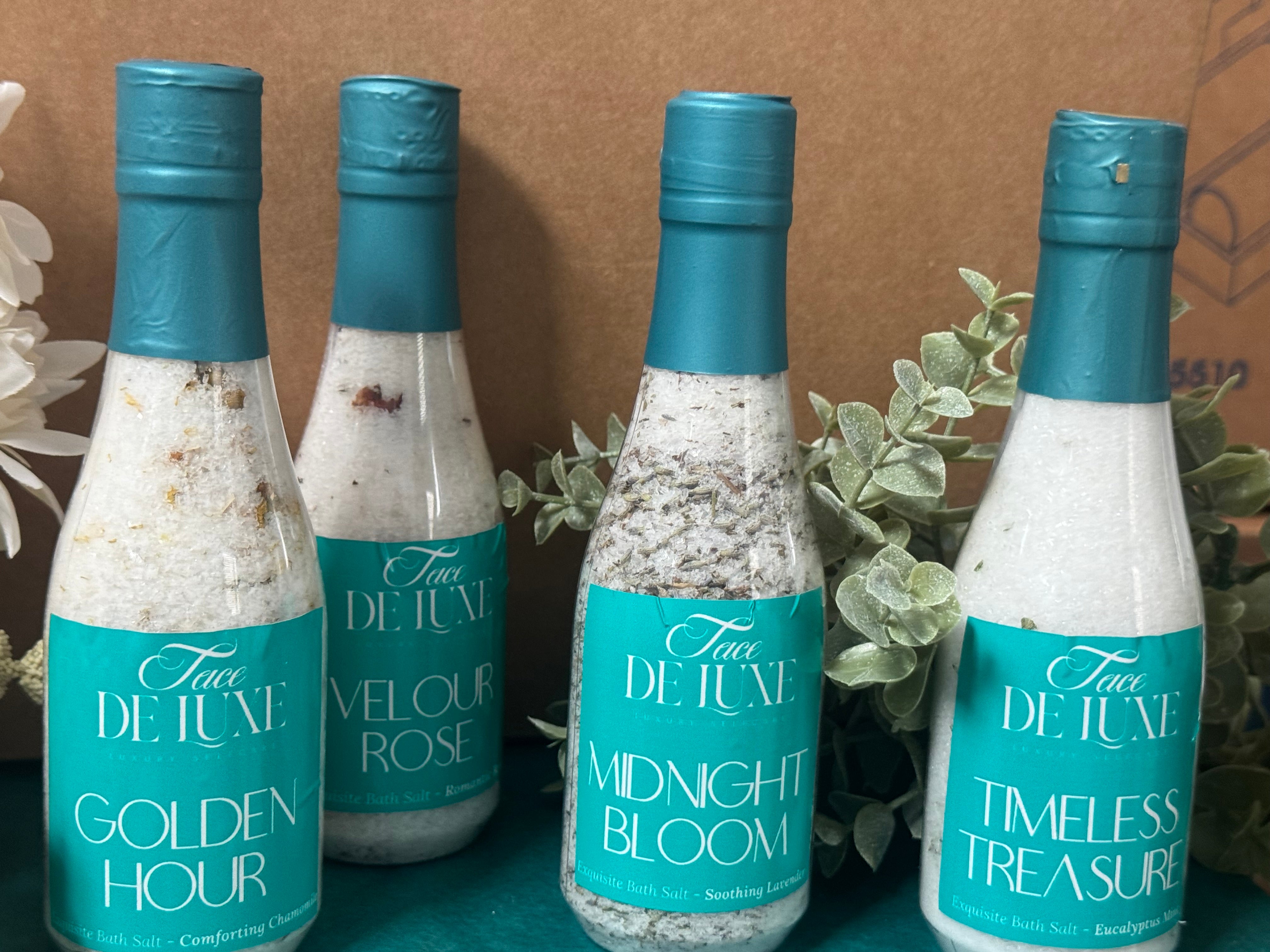 Glamorous 8 oz mini “champagne bottles” of healing bath salts.